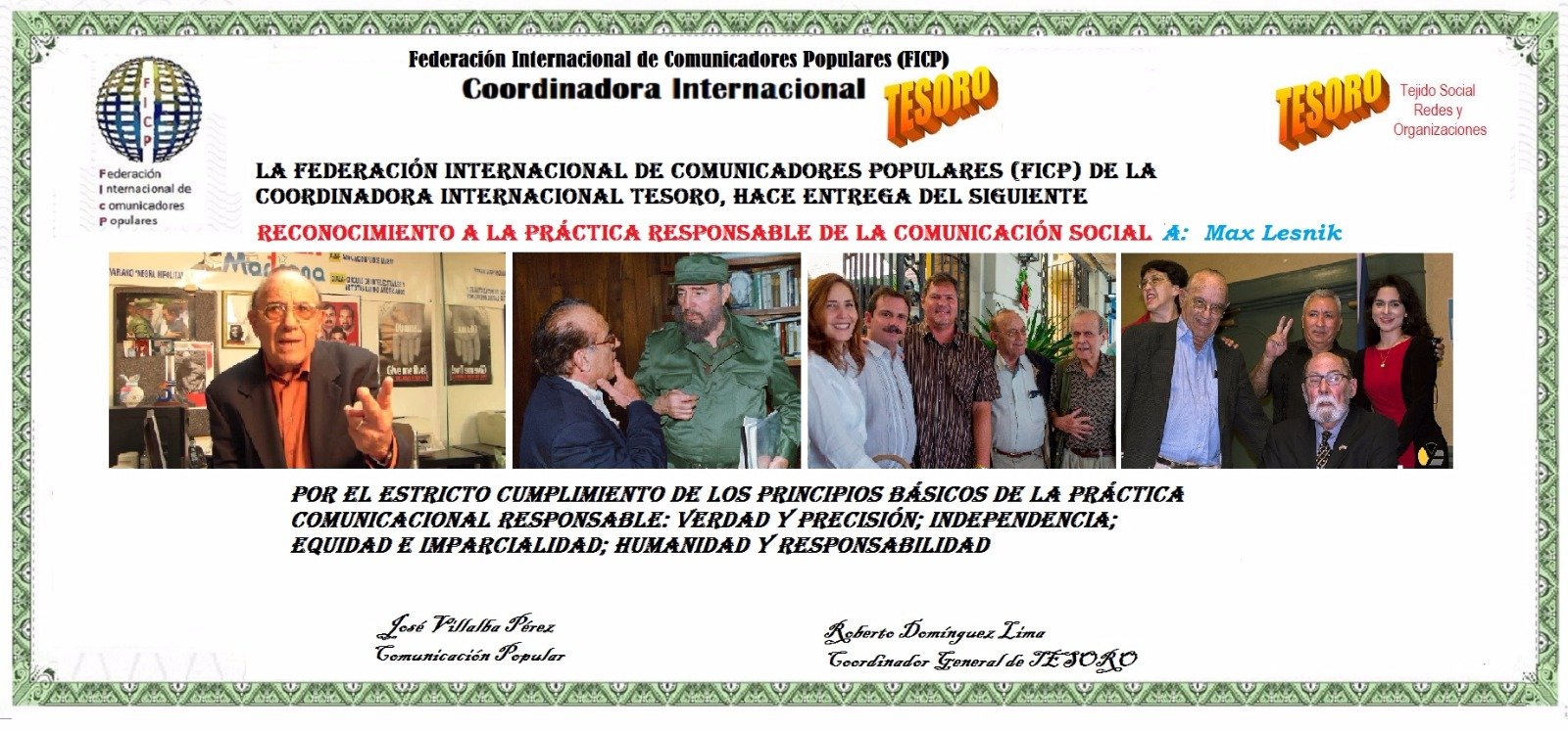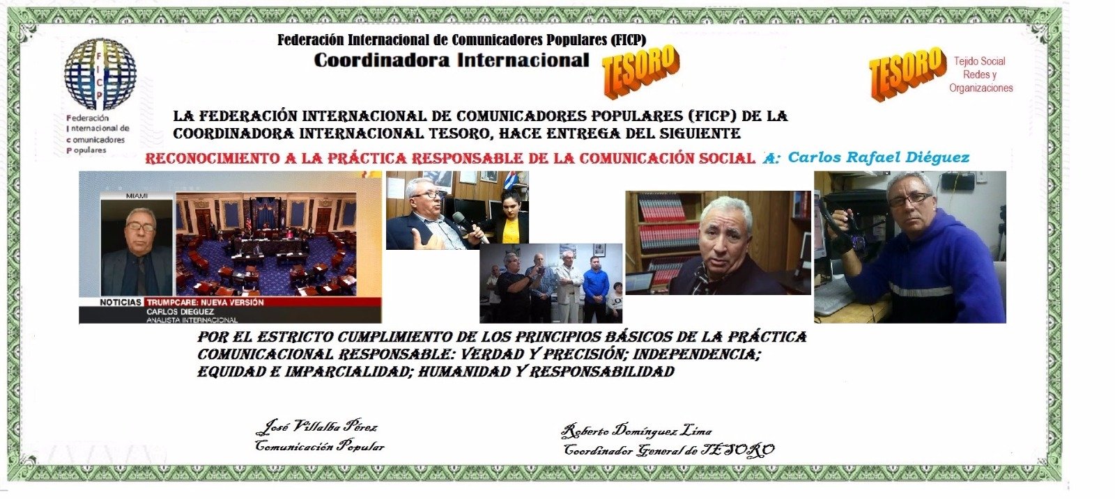 De la misma manera que fueron estimulados los medios Prensa Latina, Telesur y otros compañeros, tanto la FICP como TESORO acordaron -después de la correspondiente consulta institucional y popular, en las redes sociales-, otorgar el alto estimulo a tres destacados periodistas cubanos que laboran y residen en Estados Unidos.