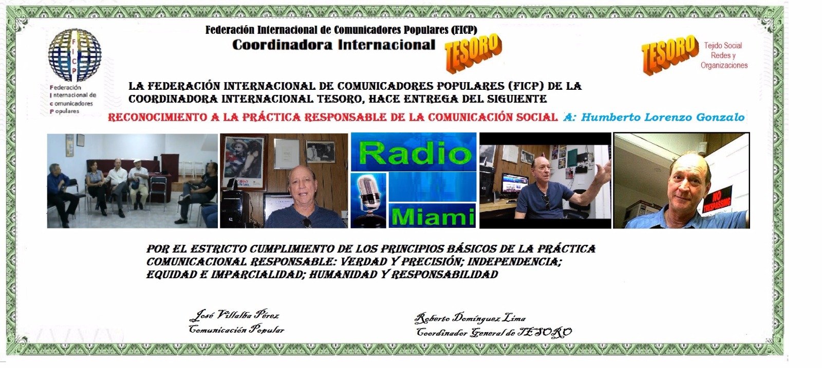 En este sentido se encargó a una Comisión creada al efecto,hacer entrega del mencionado Reconocimiento a Max Lesnik, Director de Radio MiamiTV; a Lorenzo Gonzalo, periodista y subdirector de Radio Miami, así como a Carlos Rafael Dieguez, Jefe de Información en Radio Miami TV, Director de Hermes América y coordinador de la Red Tesoro para América del Norte (NorAm).
