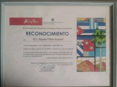 Reconocimiento otorgado por la Cancillería de Cuba a investigadores con aportes científicos relevantes para la política exterior en el 2025. Todo un honor y motivo de mayor compromiso con la ciencia aplicada a la toma de decisiones! Gracias a todos los que acompañaron este proceso de continuo crecimiento profesional!!!