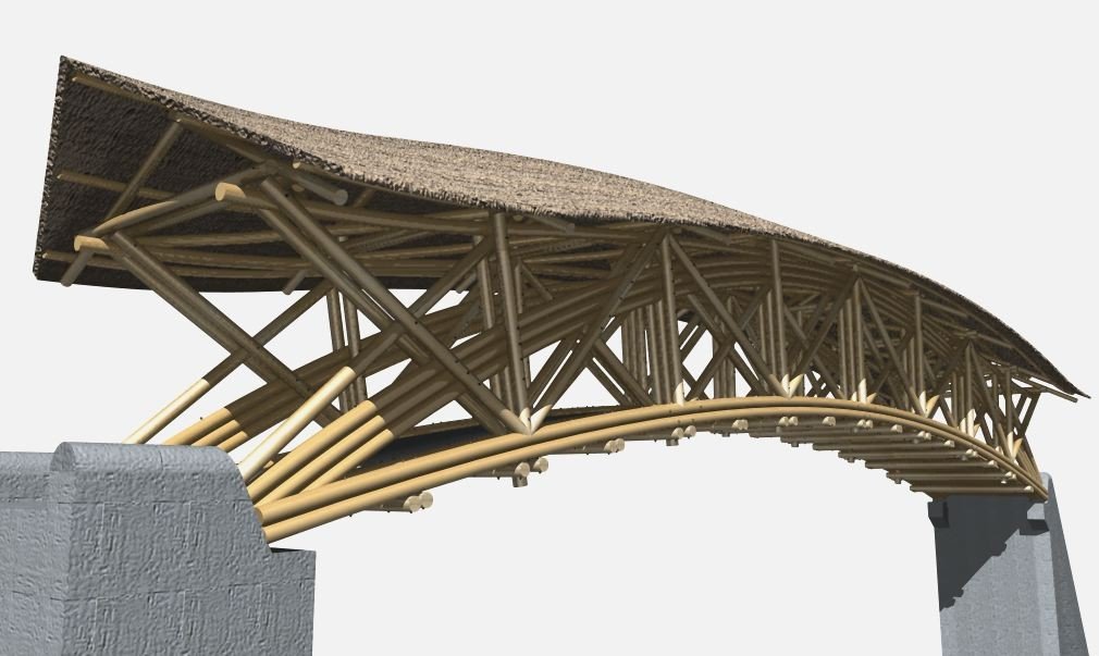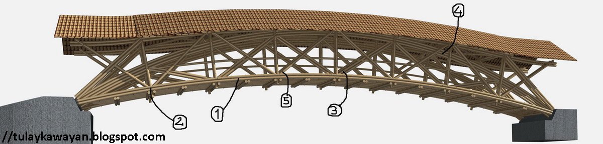 Los soportes verticales a intervalos regulares acompañan a los arcos para proporcionar un apoyo adicional a la estructura del techo. Para prolongar la longevidad del puente, el piso está hecho de hormigón armado y su techo tiene aleros para proteger al bambú petung tratado, frente a las lluvias tropicales estacionales.