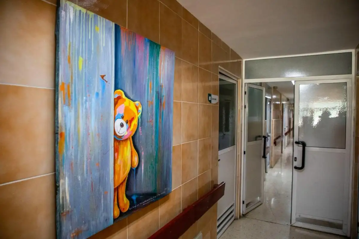 Todas las paredes de esa área del hospital son una fiesta para la vista. No hay en ellas nada que recuerde el sufrimiento y el dolor de los pequeños y sus familiares. Se asemejan al más alegre salón escolar. Se diferencian del amarillo pálido de otras paredes del sanatorio.