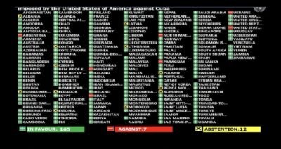 La resolución «Necesidad de poner fin al bloqueo económico, comercial y financiero impuesto por los Estados Unidos de América contra Cuba» fue respaldada de forma masiva por la comunidad internacional, reflejando el consenso global contra esta política . Los resultados oficiales de la votación son :