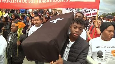 AMY GOODMAN: Decenas de miles de manifestantes salieron a las calles el viernes 26 de julio en más de cincuenta ciudades y pueblos de toda Colombia, para protestar contra la oleada de asesinatos de líderes indígenas, afrocolombianos y ambientalistas en los últimos años. Marchas solidarias se dieron alrededor del mundo, de Washington DC, a México DF y Atenas. En 2016, el Gobierno colombiano y los rebeldes de las FARC firmaron un histórico acuerdo de paz para sacar al país de medio siglo de conflicto armado. Sin embargo, desde entonces casi quinientos activistas pro derechos humanos, muchos de ellos de la comunidad afrocolombiana, han sido asesinados por su trabajo contra la minería ilegal, el tráfico de drogas y a favor de la restitución de tierras y las causas ambientales.