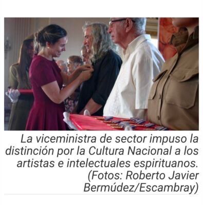 Lizette Martínez Luzardo, viceministra de Cultura, impuso la medalla a los artistas e intelectuales, entre los que se destacan el escritor Ángel Martínez Niubó, la historiadora María Antonieta Jiménez Margolles y la promotora Estela Aguilar Pedrosa.
