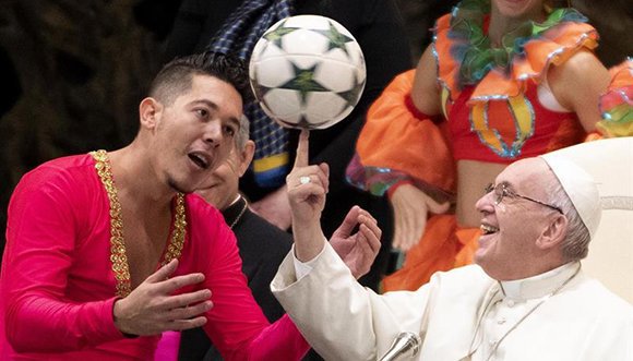E incluso el propio pontífice llegó a implicarse, cuando uno de los artistas puso a rodar un balón sobre su dedo.