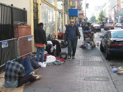 La grabación muestra una calle de la ciudad californiana repleta de tiendas de campaña donde se refugian personas sin hogar.