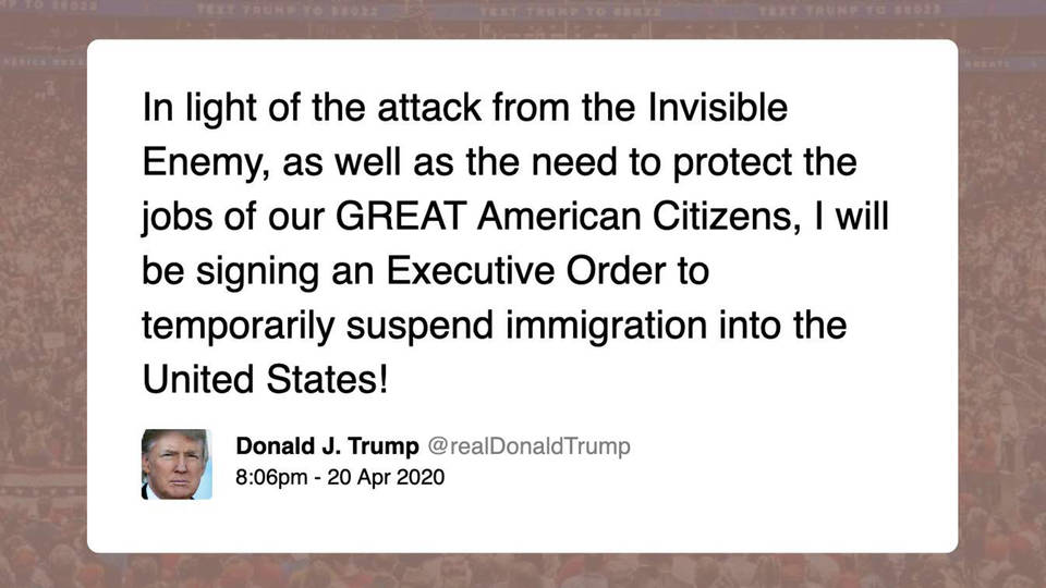 El presidente estadounidense, Donald Trump, anunció el lunes que suspenderá toda la inmigración al país mediante una orden ejecutiva. Se trata de la medida más drástica tomada por el mandatario hasta el momento para reducir la entrada de extranjeros en el país. Trump anunció la medida en Twitter el lunes por la noche, pero no ofreció detalles sobre el fundamento jurídico de la decisión.