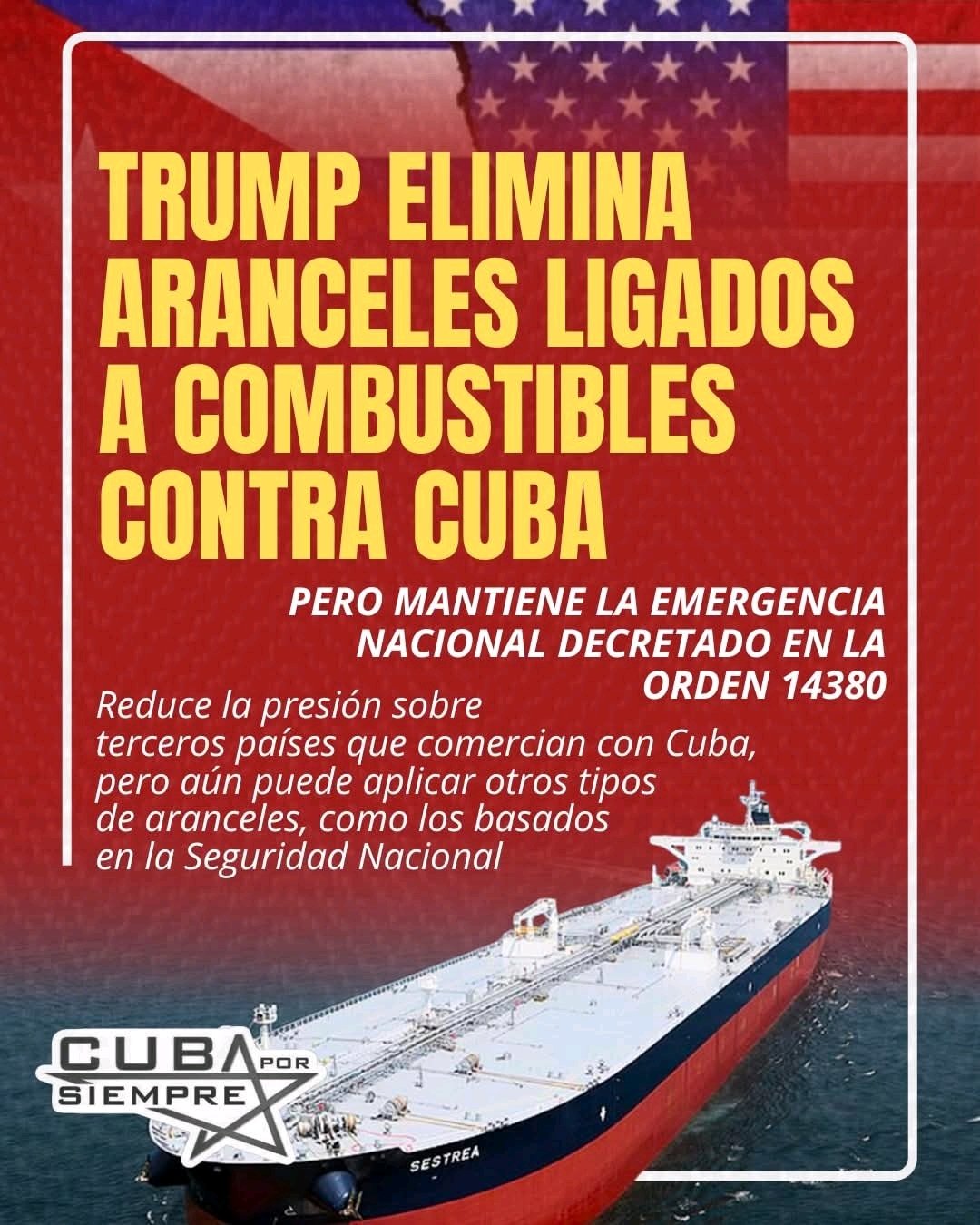 馃嚭馃嚫馃嚚馃嚭 El presidente de los Estados Unidos, Donald J. Trump, emiti贸 hoy una orden ejecutiva que elimina los aranceles adicionales sobre importaciones de combustible impuestos a Cuba bajo la Orden Ejecutiva 14380. Sin embargo, y de manera parad贸jica, la orden mantiene vigente la declaraci贸n de emergencia nacional contra la isla, que sigue siendo el fundamento legal para el resto de las medidas coercitivas del bloqueo.