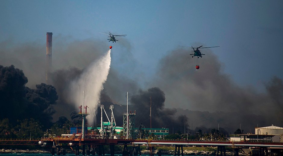 - Alexander Ávalos Jorge, segundo jefe del Departamento Nacional de Extinción del Cuerpo de Bomberos de Cuba, declaró que el incendio en la Base de Supertanqueros de Matanzas se encuentra en un estado diferente al de días anteriores, pero todavía es muy complejo y difícil
